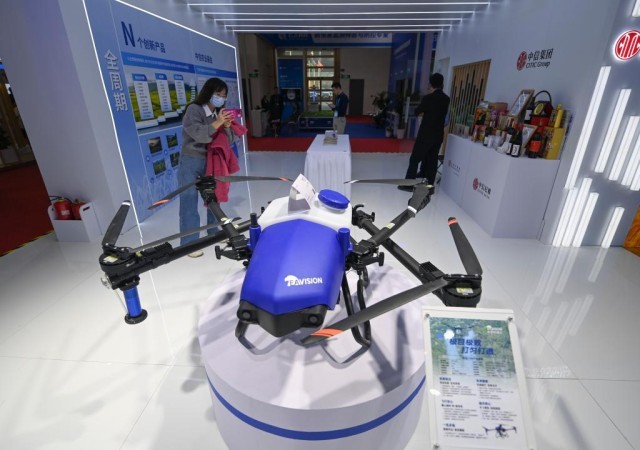 11月30日,在链博会绿色农业链展区中信集团展台,参观者观看一台智能植保无人机。新华社记者 蔡湘鑫 摄