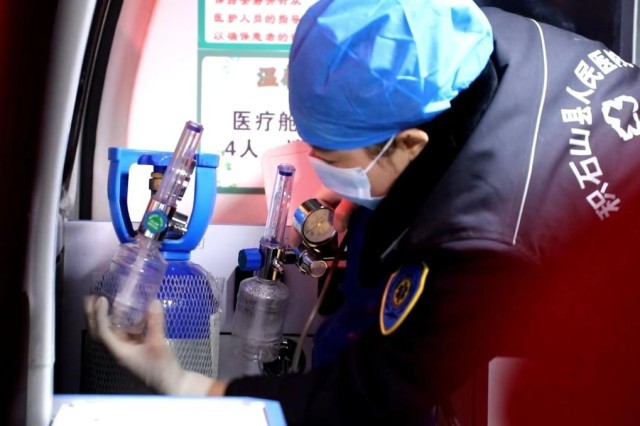 12月19日,在积石山县人民医院门前的救护车上,一名医务人员为往临夏州人民医院转运重症伤员做准备。新华社记者 郎兵兵 摄