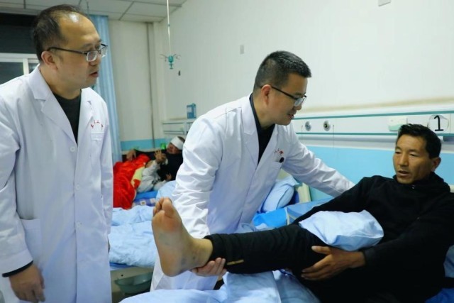 12月19日,在积石山县人民医院,兰大二院普外科主任医师罗长江(中)与骨科主任医师王凯(左)检查轻症伤员情况。新华社记者 郎兵兵 摄