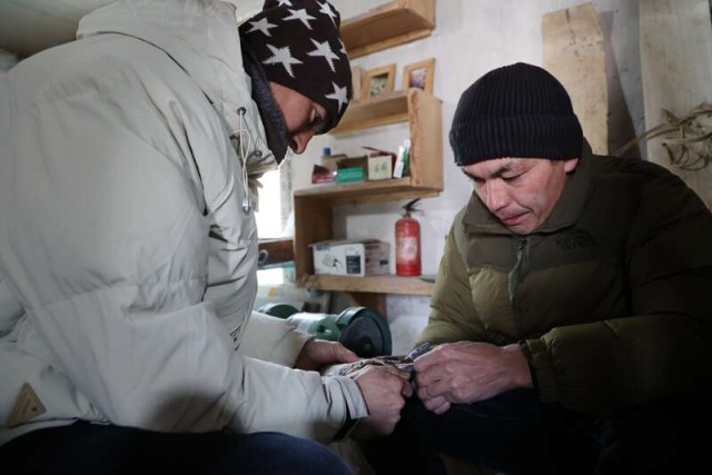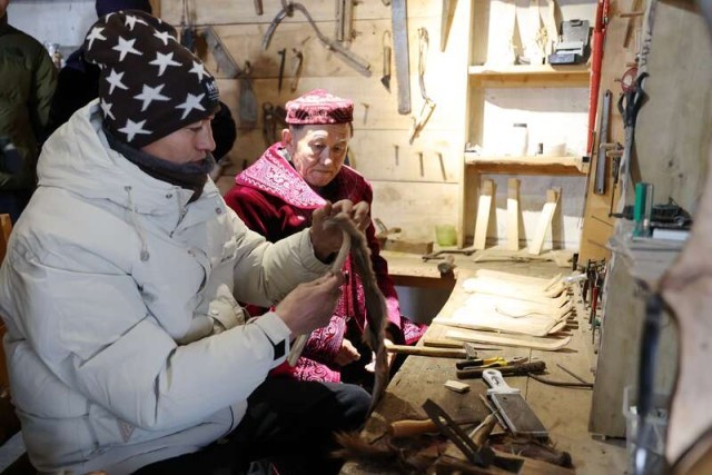 12月20日,胡安什别克· 斯兰别克的徒弟在学习毛皮滑雪板的制作技艺。中青报·中青网记者 谢洋/摄