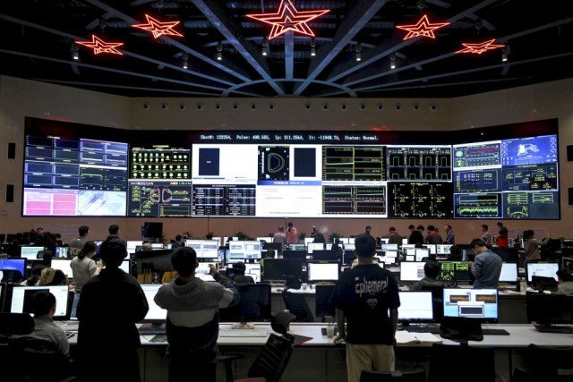 这是实验成功后的全超导托卡马克核聚变实验装置(EAST)控制大厅(2023年4月12日摄)。新华社记者 黄博涵 摄