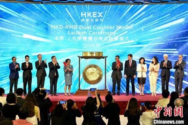 图为今年6月,香港交易所举办“港币——人民币双柜台模式”启动仪式,庆祝双柜台模式正式推出。(资料图片)中新社记者 李志华 摄