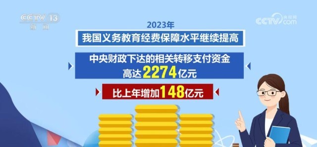 2023年,我国义务教育经费保障水平继续提高,中央财政下达的相关转移支付资金高达2274亿元,比上年增加148亿元。2023年,一系列义务教育重大工程项目继续实施,让中小学办学条件不断优化。其中,义务教育薄弱环节改善与能力提升项目中央安排330亿元,支持各地义务教育学校标准化建设。