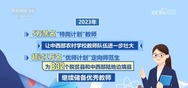 强教必先强师。2023年,5万余名“特岗计划”教师让中西部农村学校教师队伍进一步壮大,超过1万名“优师计划”定向师范生为832个脱贫县和中西部陆地边境县继续储备优秀教师。