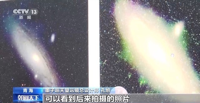 墨子巡天望远镜总设计师 孔旭:这张是首光仪式(9月17日)发布的图片,是望远镜早期拍摄的图片。这张是后来,望远镜性能进一步提升以后拍的照片。可以看到后来拍摄的照片把星系外面比较暗的区域都拍摄出来了。说明我们望远镜在经过一段时间的调试后,性能得到进一步提升。