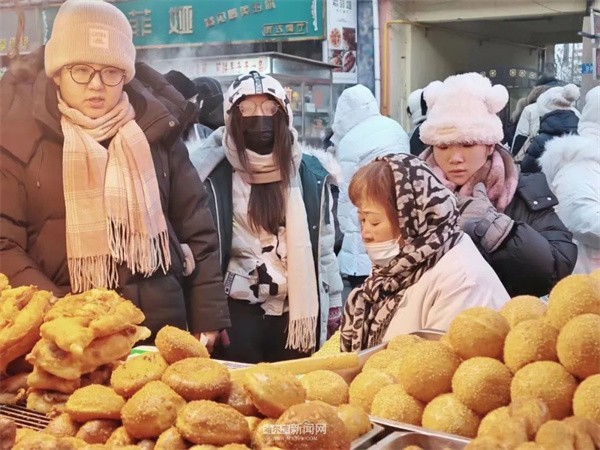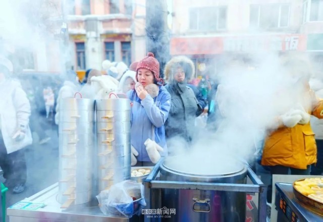 蛋堡、粘豆包、炖梨、油炸糕……几乎所有热气腾腾的摊位前都排着长队。穿梭的人群中,总能看到一边捧着炖梨当暖手宝,还不忘咬一口刚买到的油炸糕的游客,快步走向下一个排着长队的摊位。