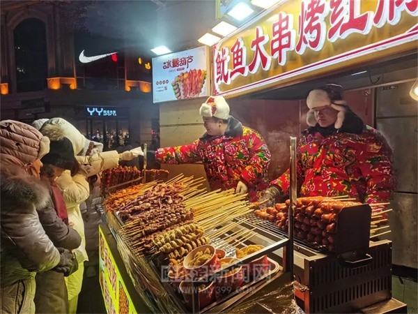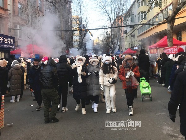 “那么一大串烤串5块钱,豆浆2块”“这包子真大啊”“烤冷面夹臭豆腐,我头一次吃,好吃”,赞叹之声不绝于耳。记者走进道里菜市场时,这里已是摩肩接踵,身穿浅色系羽绒服搭配可爱毛绒帽子的外地游客成了人群的主流。