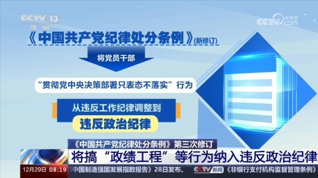 针对近年来,执纪监督中发现的一些党员领导干部政绩观扭曲、错位等问题,《条例》修订过程中,将政绩观错位的相关处分规定纳入政治纪律,规定,党员领导干部政绩观错位,违背新发展理念、背离高质量发展要求,给党、国家和人民利益造成较大损失的,给予警告或者严重警告处分;情节较重的,给予撤销党内职务或者留党察看处分;情节严重的,给予开除党籍处分;搞劳民伤财的“形象工程”“政绩工程”的,从重或者加重处分。