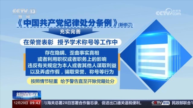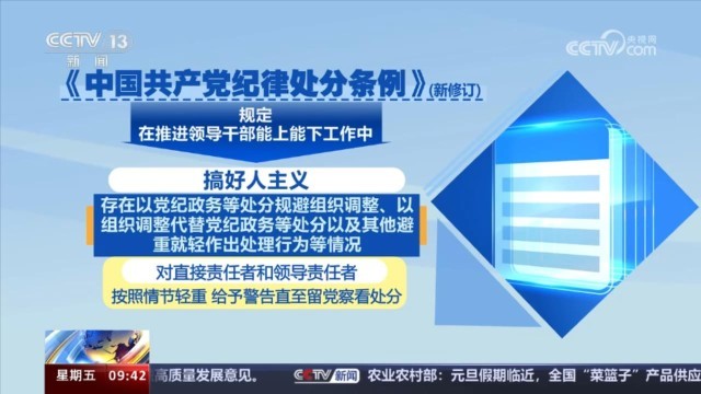 央视网消息:新修订的《中国共产党纪律处分条例》明确了政治纪律、组织纪律、廉洁纪律、群众纪律、工作纪律、生活纪律等六项纪律。