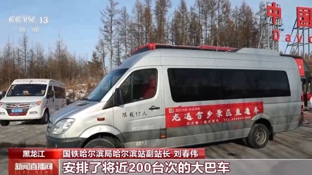 国铁哈尔滨局哈尔滨站副站长 刘春伟:我们与亚布力管委会建立了对接机制,在哈尔滨站、哈尔滨西站、亚布力西站开通了公铁联运的服务,定制了一站运输,每天在大巴车接驳上安排了将近200台次的大巴车。