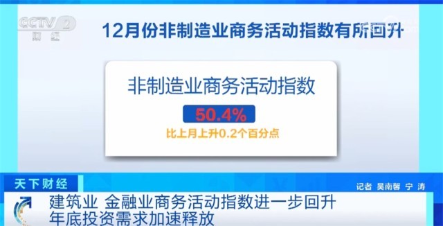 此外,12月份非制造业商务活动指数为50.4%,比上月上升0.2个百分点,非制造业扩张有所加快。其中,建筑业和金融业商务活动指数进一步回升,均创出近期新高。