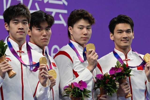 9月26日,杭州亚运会男子4X100米混合泳接力决赛,由潘展乐、王长浩、覃海洋、徐嘉余(从左至右)组成的中国队,以3分27秒01打破亚洲纪录的成绩夺冠,并创造本年度该项目的世界最佳成绩。视觉中国供图