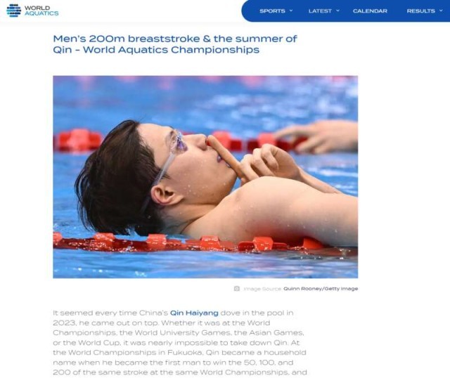 世界泳联官方网站在回顾2023赛季世界泳坛精彩时刻的一篇文章中,以一个章节介绍中国选手覃海洋。世界泳联官方网站截图