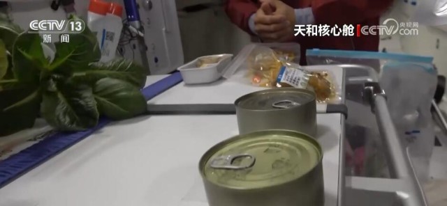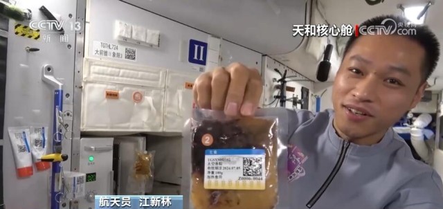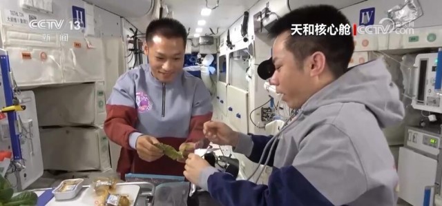 航天员 江新林:我是今天的太空美食家,让我带领大家一起来探索发现今天的太空美食。我们先看一下主食,热乎乎的,看看里面都有什么吧,有01最爱吃的白米饭,小心烫哦,02爱吃的面条,我的炒饭。好了,把它粘在餐桌上。然后再让我们看看我为他们准备的惊喜。看看这是什么?这是我们冬至特意结余的饺子,还有蔬菜副食。地面上的工作人员考虑得特别周到,按照个人的口味为我们准备了美味的食品,而且将它们塑封包装,给我们节余时间的时候又保证它的口味。这是网红太空香粽,大家印象比较深刻吧,还有这个年糕也是特别好吃、特别美味,还有红烩猪排,保证有足够的蛋白质摄入量。很丰盛。请看这里,我们特意留了一些新鲜的水果,看看都有什么吧,有美味的苹果,还有葡萄,大家这个都特别爱吃,我们三个在一起分享一下。
