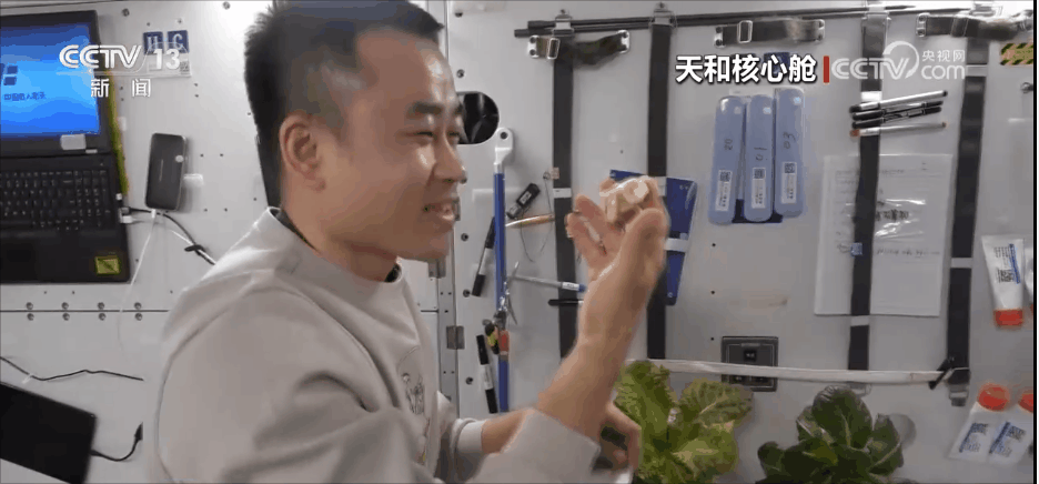 航天员 唐胜杰:你好,我正在对我们的樱桃番茄进行授粉。因为太空没有小蜜蜂,我就是那只小蜜蜂。大家看一看,这是我们的太空蔬菜,神十七乘组在“太空出差”期间,我们的太空菜园变得更大了,大家看看我们的蔬菜是不是长势喜人?今天是新年的第一天,江新林为我们准备了营养丰盛的太空午餐,但是我觉得今天应该再增加一点绿色的、新鲜的蔬菜,午餐就会变得更丰盛了。大家可以看一看,看看我们的樱桃番茄。诶,拿这两杯,今天中午我们就吃这两杯。