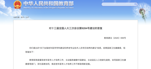 早在2021年,教育部官网曾公布《对十三届全国人大三次会议第9284号建议的答复》,下一步,教育部将进一步加强面向全体医学类专业学生开展老年医学教育,同时,协同国家卫生健康委,鼓励高校加强老年医学学科建设、推进老年医学专科医师规范化培训。