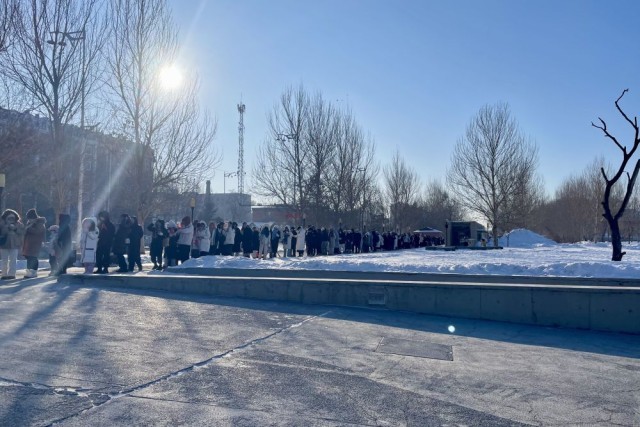 9日早上,哈尔滨气温低至零下20摄氏度,陈列馆外早已排起长队。为了迎接高峰,陈列馆延长开放时间,游客通过网上预约可免费入馆参观,还有志愿者送上热水或玉米糊帮他们驱寒。