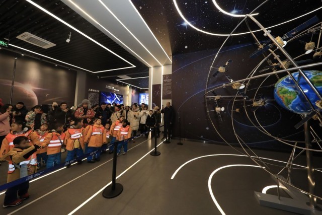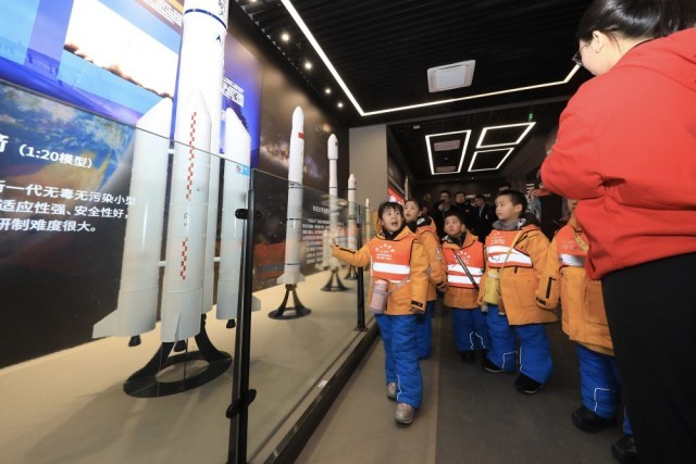 1月6日,“小砂糖橘”参观哈尔滨工业大学航天馆。新华社发