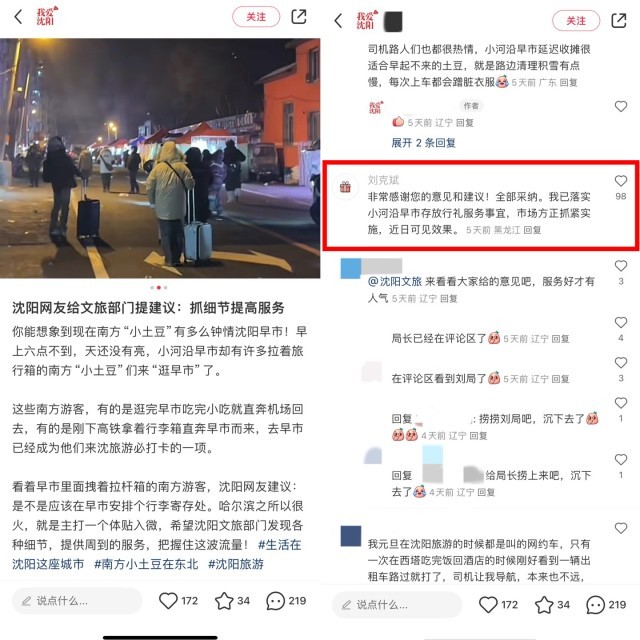 1月5日,沈阳市文旅局局长刘克斌回复道:“非常感谢您的建议!全部采纳。我已落实小河沿早市存放行李服务事宜,市场方正抓紧实施,近日可见效果。”