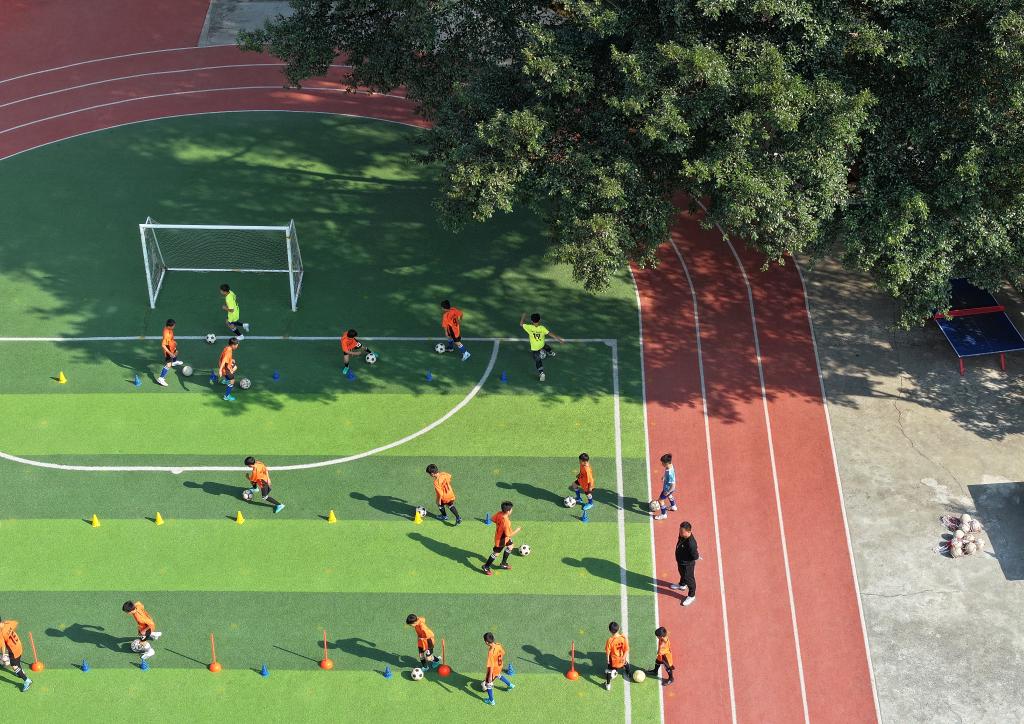2023年12月26日,小球员在贵州榕江水尾水族乡中心校内训练。(无人机照片)。新华社记者刘续摄