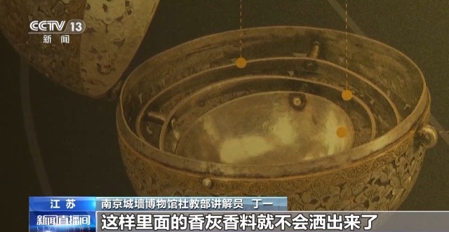 南京城墙博物馆社教部讲解员 丁一:它的体量非常大,所以能容更多的香丸、香灰等等,所以是放在马车当中或室内使用的。它中间香盂的位置是盛放香料的,内机环和外机环是保持平衡的,摇晃的时候香盂还是保持平衡的状态,这样里面的香灰就不会洒出来了。