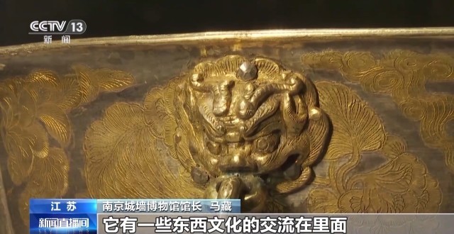 南京城墙博物馆馆长 马藏:这次展出的文物里面有一件鸳鸯银镏金的大银盆,主体是银的,上面的鸳鸯纹饰是做鎏金处理。包括铸造、錾刻、捶揲、铆接,它是多种工艺铸造的一件精品文物,它有东西方文化交流在里面,反映了唐代兼容并蓄、包容的环境。