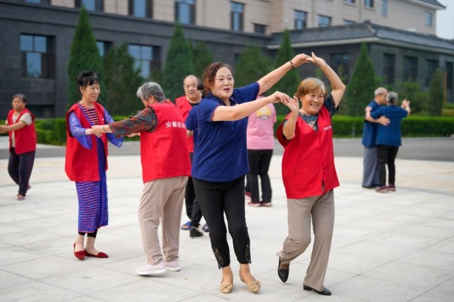 2023年9月12日,河北省唐山市古冶区一家养老机构的老人们在院子里运动。新华社记者牟宇 摄