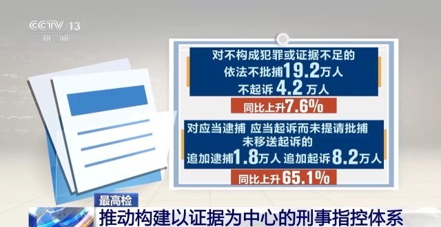 对不构成犯罪或证据不足的依法不批捕19.2万人、不起诉4.2万人;对应当逮捕、应当起诉而未提请批捕、未移送起诉的,追加逮捕1.8万人、追加起诉8.2万人,同比分别上升7.6%和65.1%。