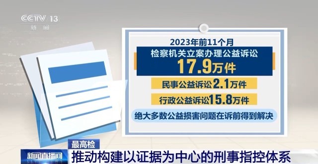 2023年前11个月,检察机关立案办理公益诉讼17.9万件,其中民事公益诉讼2.1万件、行政公益诉讼15.8万件。绝大多数公益损害问题在诉前得到解决。