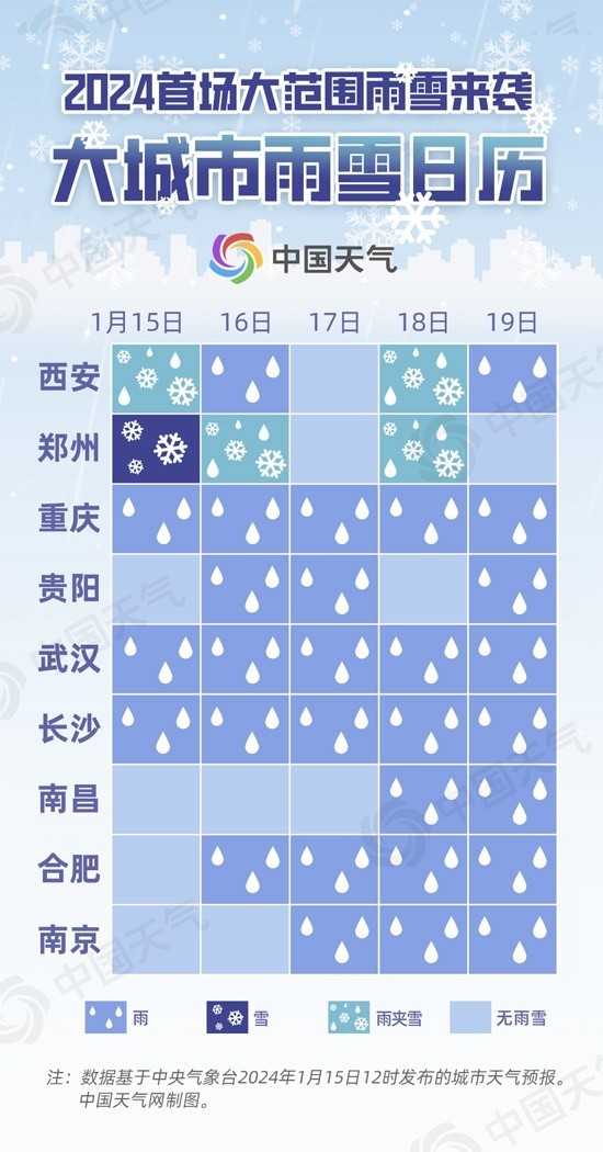 央视网消息:据中国天气网讯,今天(1月15日)白天,2024年首场大范围雨雪过程已上线,陕西、河南部分地区飘雪。预计本周,这波雨雪天气还将向东扩展,波及山东、安徽等20余省区市。此轮过程降水相态复杂,北方多地雨雪频繁转换,南方降雨持续时间较长。中国天气网推出大城市雨雪日历,看哪些地方雨雪将频繁打卡。