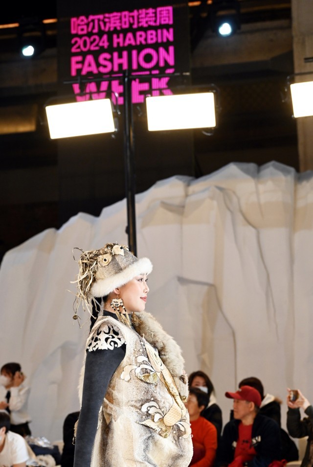 同江赫哲族模特身穿传统赫哲族鱼皮衣亮相2024哈尔滨国际时装周(央广网发 郭俊峰 摄)