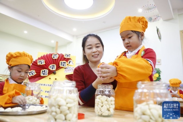 1月17日,山东省滨州市滨城区清怡幼教集团第十一实验幼儿园的孩子们在学习制作腊八蒜。新华社发(初宝瑞 摄)
