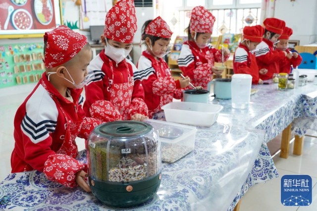 1月17日,河南省焦作市博爱县县直幼儿园,孩子们体验制作腊八粥。新华社发(程全 摄)