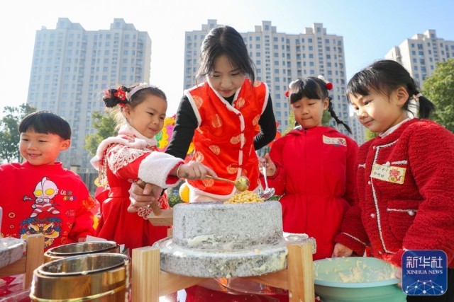 1月17日,在位于浙江省湖州市德清县武康街道的千秋幼儿园,小朋友在老师的指导下磨豆腐。新华社发(王正 摄)