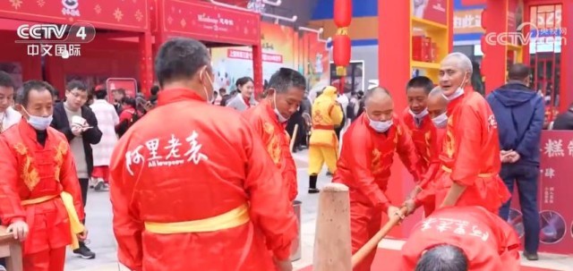 在江西上饶,当地的年糕节热闹喜庆。木制榔头反复捶打,蒸熟的米粒在石臼中逐渐成团,年糕渐渐成型,米香四溢。
