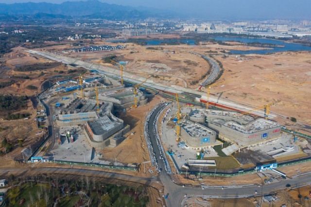 空中俯瞰浙江金漪湖科技创新策源地重大基础设施项目施工现场(2024年1月3日摄,无人机照片)。新华社记者 徐昱 摄