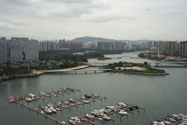 横卧碧波的五座圆拱大桥是五缘湾的醒目标志。“为了保护500多棵树木,我们的桥在那里绕了一个弯。”王达指着不远处的天缘大桥说。