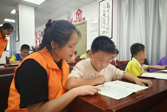 “希望家园”爱心暑托班志愿者为留守儿童辅导功课。