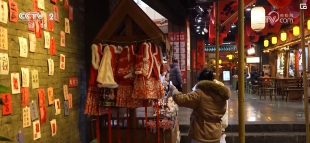 在中国人的习俗中,过年少不了赶集。长沙在宋朝时被称作潭州,是重要的商业中心之一。在宋风市井文化体验地潭州市集,春联、龙灯等装饰吸引了不少游客。