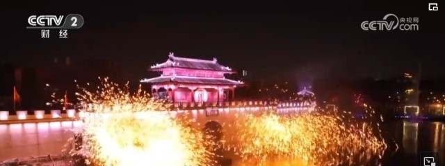当夜幕降临,八朝古都开封也在灯光的装扮下流光溢彩。“打铁花”是流传于豫晋地区民间传统的烟火,至今已传承千余年。在清明上河园内,表演者先将铁水舀起抛向空中,再用力击打空中的铁水,一时间铁花飞溅、流星如瀑。园内,亭台楼阁雕梁画栋、虹桥清波舟船往来,大型实景水上演出再现了北宋汴梁的盛世繁荣。