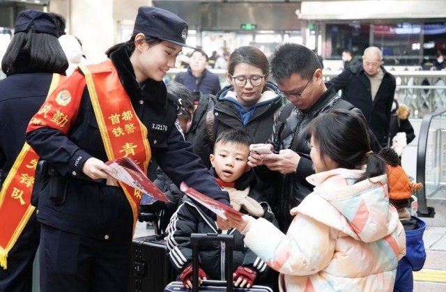 2024年1月26日,北京铁路公安局民警在北京西站发放出行安全宣传单。新华社记者 李欣 摄