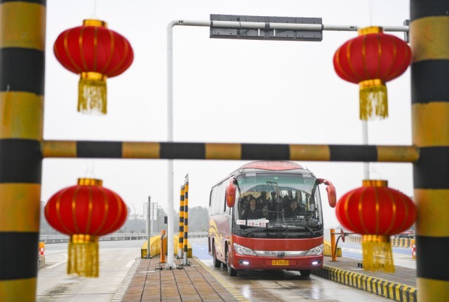 2024年1月26日,公共汽车经过重庆绕城高速支坪收费站。新华社记者 王全超 摄