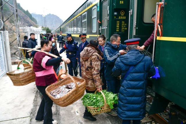 1月26日,在沪昆铁路六个鸡火车站,村民准备登上5640次列车售卖蔬菜和年货。新华社记者 杨文斌 摄