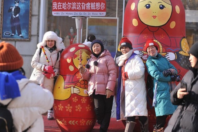 △ 2023年12月19日,哈尔滨,游客拿着糖葫芦合影留念。