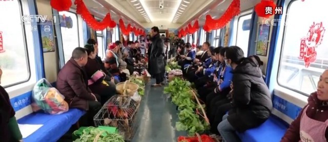 买年货,除了商超、集市,批发市场,还可以在火车上。在贵州,有一趟往返于贵阳与玉屏之间的“慢火车”5640次列车,里面专设了一个农特产品车厢。新春临近,列车上的农特产品车厢变得热闹起来,村民们将自家养殖的土鸡、鸡蛋,熏制的香肠、腊肉,以及水果、蔬菜带上列车,向旅客现场售卖,车厢里喜气洋洋。