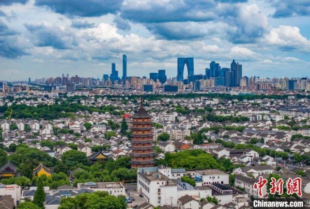 资料图:苏州古城近处的北寺塔与远处的现代楼宇相呼应。 泱波 摄