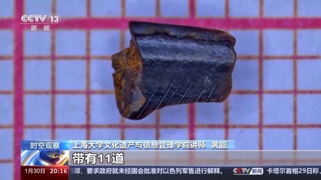 上海大学文化遗产与信息管理学院讲师 黄超:像有一件骨锥,它上面就是有一系列的连续的5个比较明显的疤痕,另外还有那件约3毫米的带有11道几乎平行的刻画痕的骨骼碎片,它是怎么样形成的?古人类为什么要这样去刻画它?是留待考古学家去解释去调查的一个谜团。