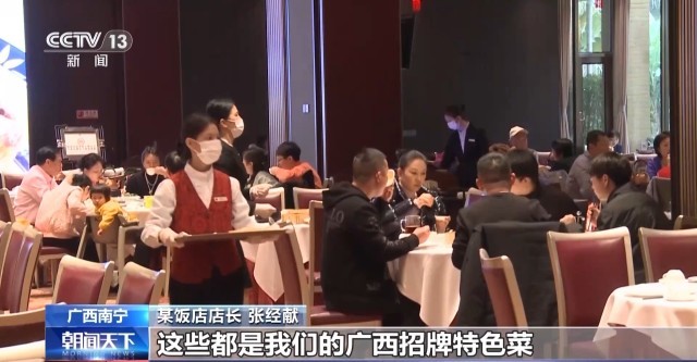 某饭店店长 张经献:招牌的老友鱼,酸酸辣辣,就是我们南宁人这边最爱的本地口味,还有荔浦芋头煲、石磨黑豆腐,这些都是我们的广西招牌特色菜。