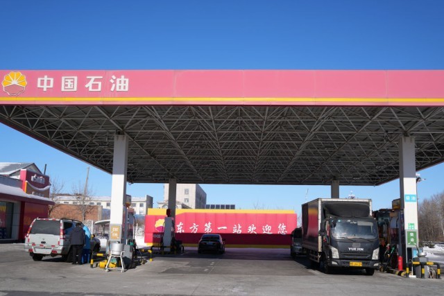 2月2日,车辆在中石油黑龙江抚远东方第一加油站加油(无人机照片)。