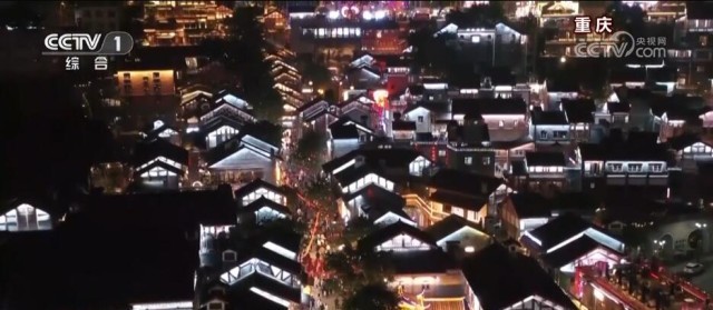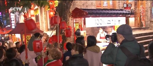 总台记者 王磊:我们可以看到,身后很多居民正在举行“打灯笼 步步高”活动。所谓“打灯笼”就是户户挂上灯笼,寓意平安健康吉祥,同时也是好运不断。“打灯笼”的人不仅有临街的商户,还有一些住在18梯的老居民。除了挂灯笼的仪式,这里还有一些工作人员,他们打扮成了财神爷和卖货郎等很多角色,在这里为游客送去平安,送去吉祥。